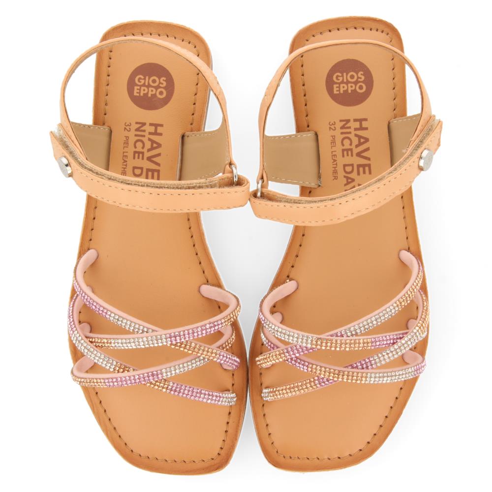 Sandali in pelle color rosa con minicristalli colorati sulla tomaia.