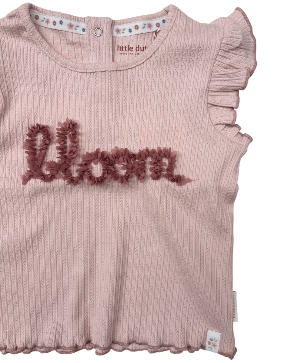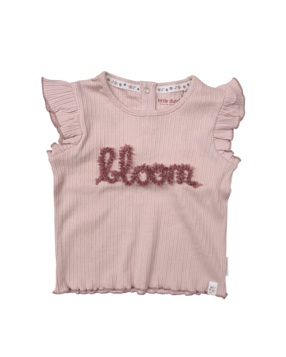 T-shirt rosa scritta “Bloom” con petali in tessuto.