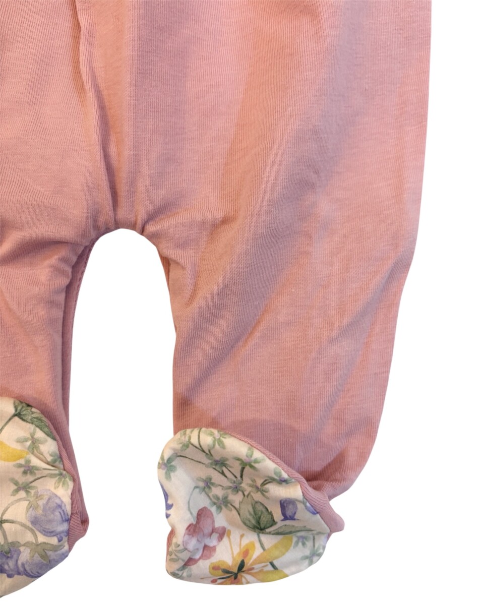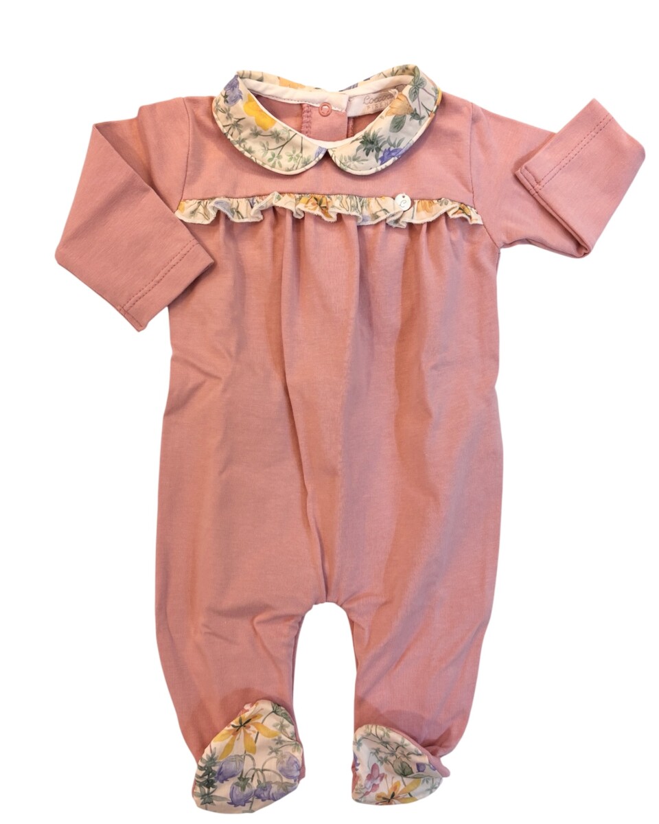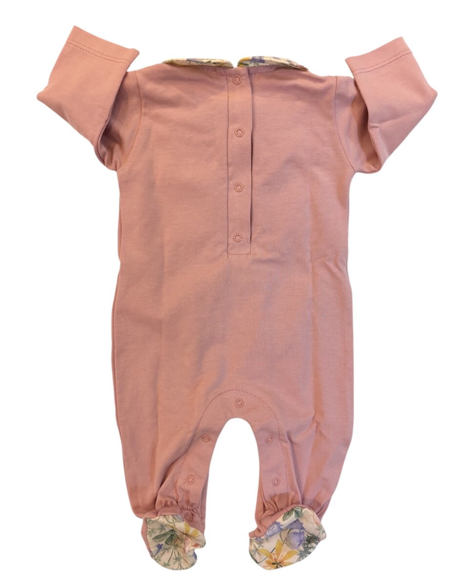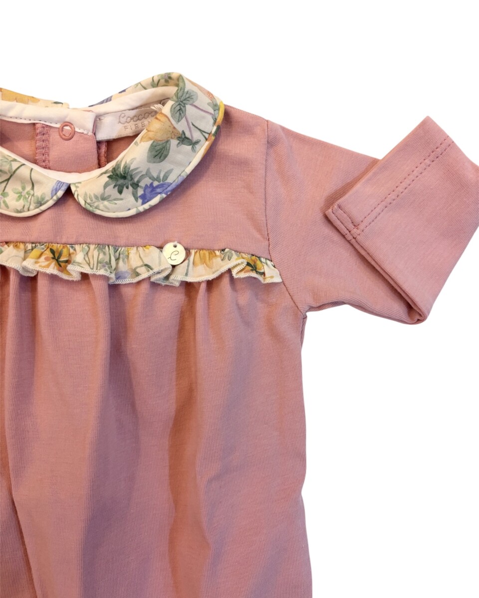 Tutina in jersey color rosa petalo e dettagli in tessuto Liberty fantasia campanellino.
